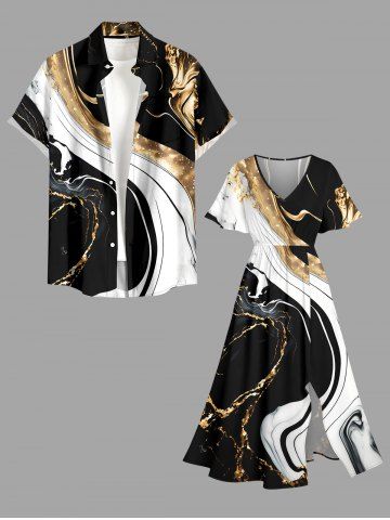 Plus Size Two Tone Curve Print Hawaii Split Pocket A Line Midi Dress - Black - 2x