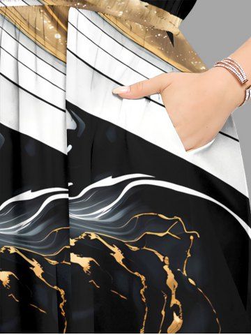 Plus Size Two Tone Curve Print Hawaii Split Pocket A Line Midi Dress - Black - 5x