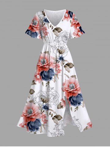 Plus Size Two Tone Flower Leaves Print Hawaii Split Pocket A Line Midi Dress - White - 3x