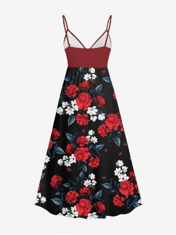 Plus Size Two Tone Floral Ombre Leaves Print Hawaii Surplice A Line Cami Dress - Red - M