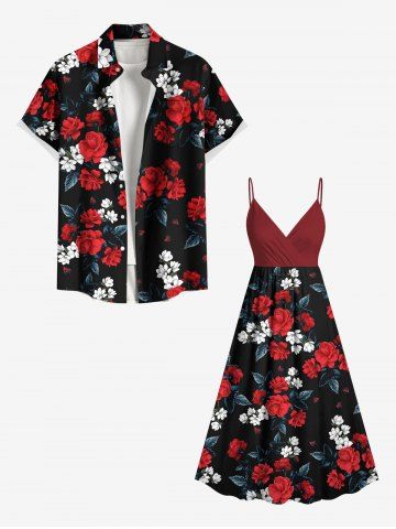 Plus Size Two Tone Floral Ombre Leaves Print Hawaii Surplice A Line Cami Dress - Red - 3x
