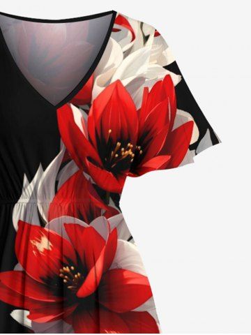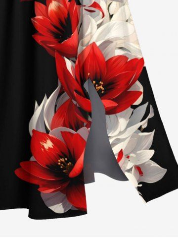 Plus Size Two Tone Flower Print Hawaii Split Pocket A Line Midi Dress - Black - 1x