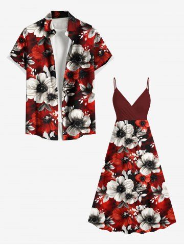 Plus Size Two Tone Flower Leaf Print Hawaii Surplice A Line Cami Dress - Red - L