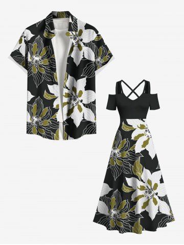 Plus Size Two Tone Flower Print Hawaii Cold Shoulder Crisscross A Line Maxi Dress - Black - 2x