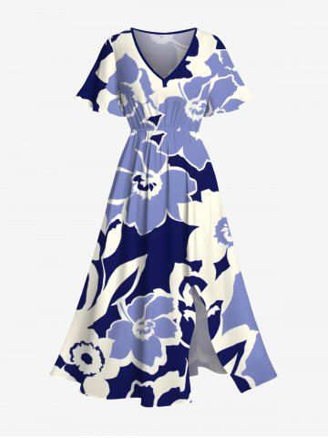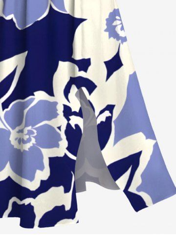 Plus Size Two Tone Flower Print Hawaii Split Pocket A Line Midi Dress - Sky Blue - S