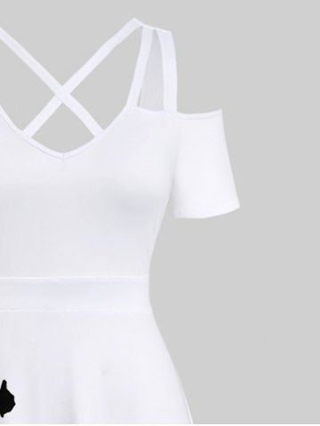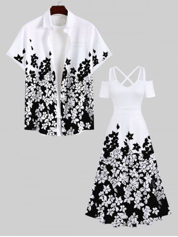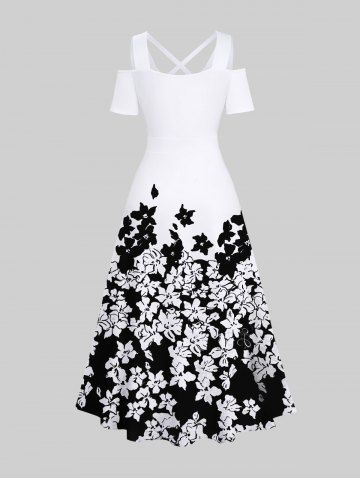 Plus Size Two Tone Flowers Colorblock Print Cold Shoulder Crisscross Hawaii Maxi Dress - White - 3x
