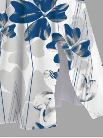 Plus Size Two Tone Leaf Print Hawaii Split Pocket A Line Midi Dress - White - S