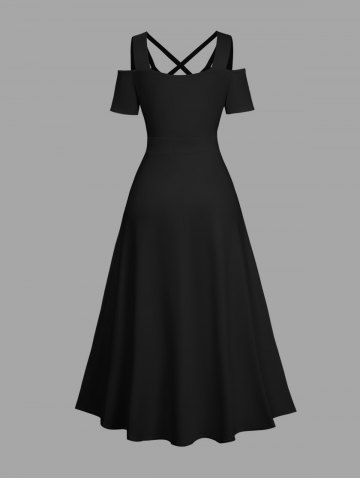 Graphic Dresses > Plus Size Two Tone Skeleton Fire Flame Print Halloween Cold Shoulder Crisscross A Line Maxi Dress