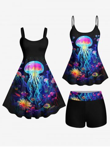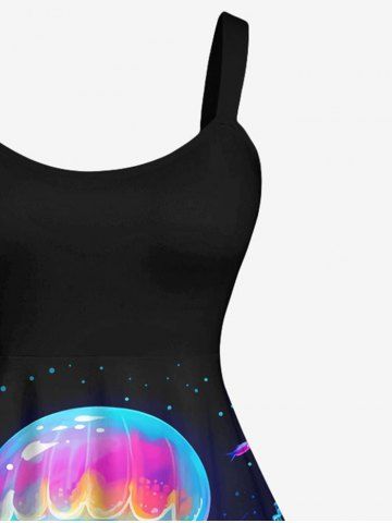Hawaii Plus Size Sea Creatures Underwater World Plant Jellyfish Glitter 3D Print Tank Dress - Black - 6x