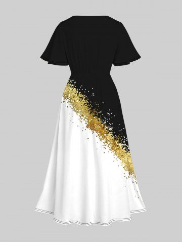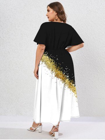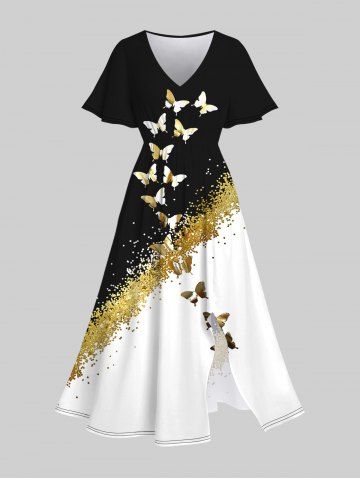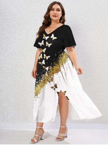 Plus Size V-Neck Sparkling Sequin And Butterfly Printed Split Dress