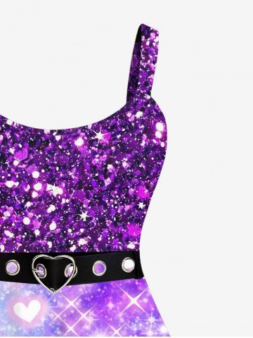 Plus Size Valentine's Day Galaxy Tie Dye Heart Grommets Belt Sparkling Sequin Glitter 3D Print Tank Dress - Purple - 6x