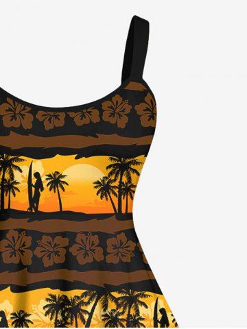 Hawaii Plus Size Vintage Coconut Tree Flower Striped Dusk Print Backless A Line Tank Dress - Deep Coffee - 6x