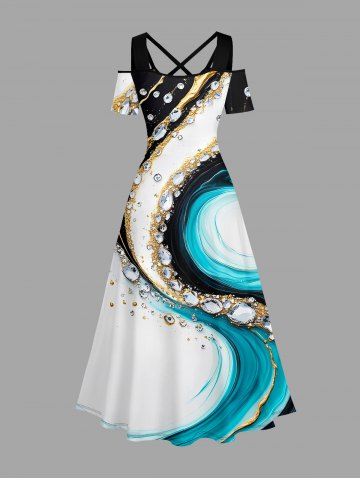 Plus Size Water Ripple Curve Diamond Print Hawaii Cold Shoulder Crisscross A Line Maxi Dress - White - Xs