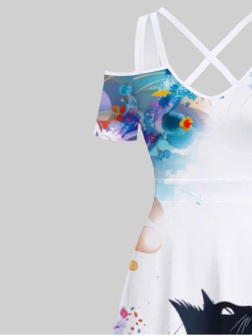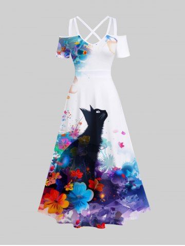 Plus Size Watercolor Floral Ink Painting Cat Print Hawaii Crisscross A Line Maxi Dress - White - S