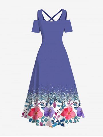 Plus Size Watercolor Floral Leaf Print Hawaii Crisscross A Line Maxi Dress - Purple - 1x