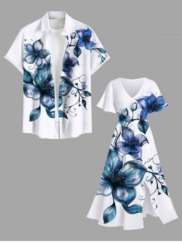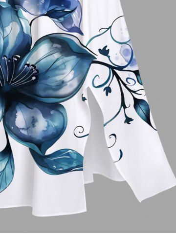 Plus Size Watercolor Floral Leaves Branch Print Hawaii Split Pocket A Line Midi Dress - White - 4x