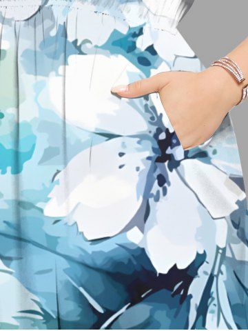 Plus Size Watercolor Flowers Leaf Print Split Hawaii Midi Dress - Light Blue - L