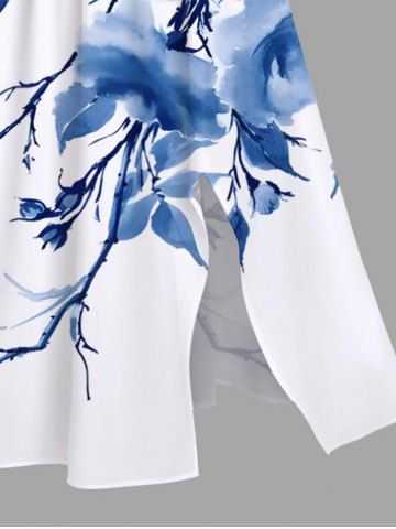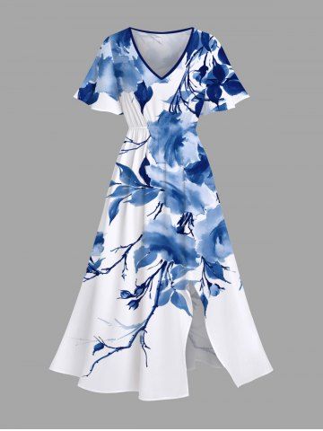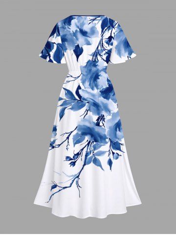 Plus Size Watercolor Flowers Leaf Print Split Hawaii Midi Dress - Blue - 5x
