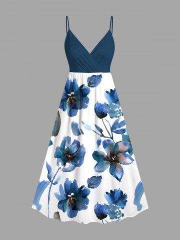 Plus Size Watercolor Flowers Print Surplice Hawaii Cami Dress - Blue - 3x