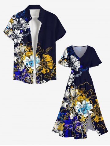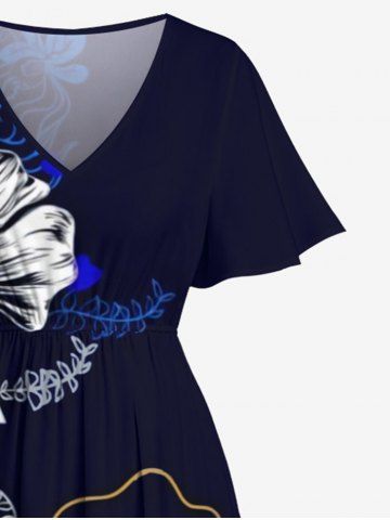 Plus Size Watercolor Painting Flower Print Split Pocket A Line Midi Dress - Black - 5x
