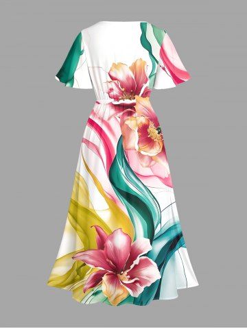 Plus Size Watercolor Ribbon Flower Print Hawaii Split Pocket A Line Midi Dress - White - S