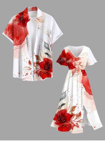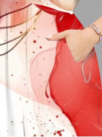 Plus Size Watercolor Tie Dye Floral Leave Line Pattern Print Hawaii Split Pocket A Line Midi Dress - Red - 3x
