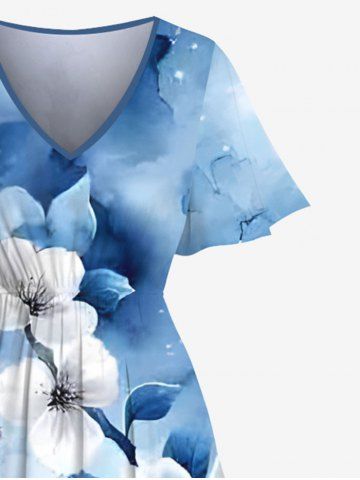 Plus Size Watercolor Tie Dye Ombre Flower Branch Print Hawaii Split Pocket A Line Midi Dress - Light Blue - 2x