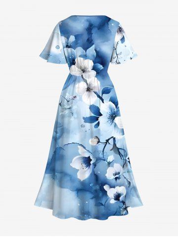 Plus Size Watercolor Tie Dye Ombre Flower Branch Print Hawaii Split Pocket A Line Midi Dress - Light Blue - 3x