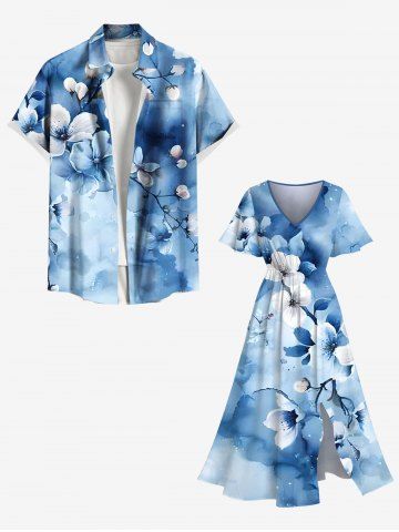 Plus Size Watercolor Tie Dye Ombre Flower Branch Print Hawaii Split Pocket A Line Midi Dress - Light Blue - 4x