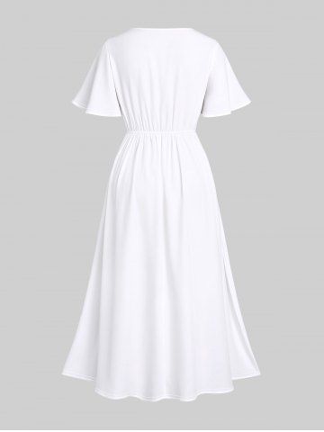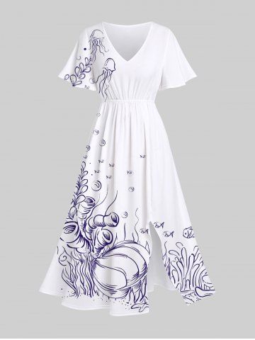 Plus Size Waterweed Starfish Fish Seabed Sailor Print Hawaii Split Pocket A Line Midi Dress - White - 5x