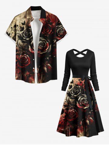 Rose Flower Leaf Paint Splatter Print Crisscross Hawaii Dress With A Belt - Black - 2xl