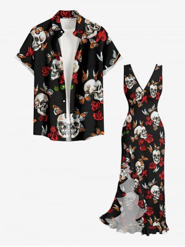 Skulls Butterfly Flower Print Ruffles Split Dress - Black - L