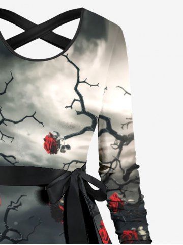 Skulls Rose Flower Ombre Print Crisscross Hawaii Dress With A Belt - Black - L