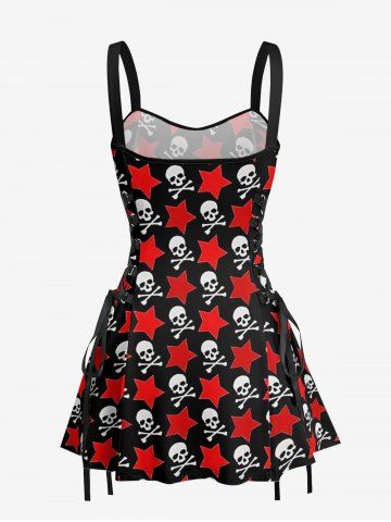 Skulls Star Print Lace Up A Line Dress - Red - Xs