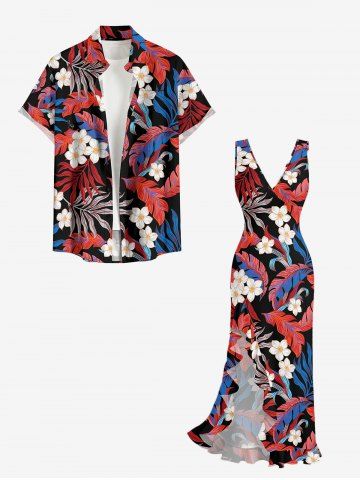 Tropical Leaf Flower Print Hawaii Ruffles Split Dress - Cherry Red - Xl