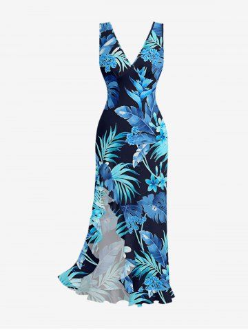 Tropical Leaf Flower Print Hawaii Ruffles Split Dress - Deep Blue - S