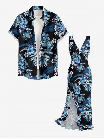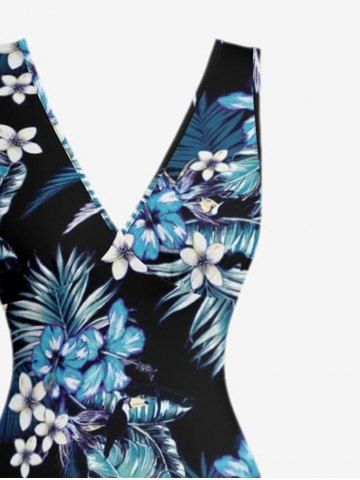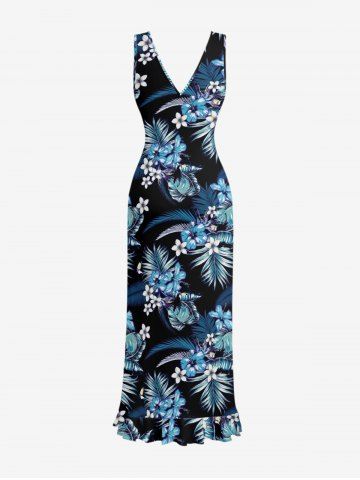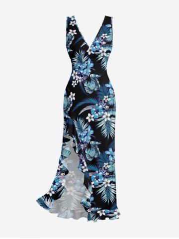 Tropical Leaf Hibiscus Flower Print Hawaii Ruffles Split Dress - Blue - Xl
