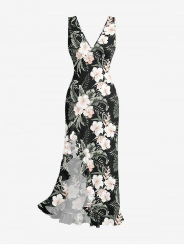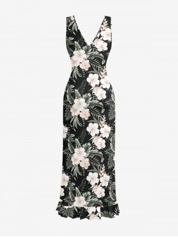 Tropical Leaf Hibiscus Flower Print Hawaii Ruffles Split Dress - Black - Xxxl
