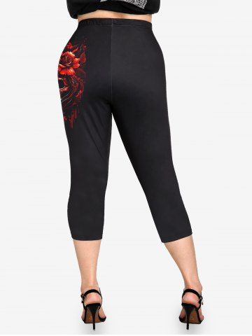 Plus Size 3D Bloody Skull Rose Flower Leaf Print Skinny Capri Leggings - Black - S