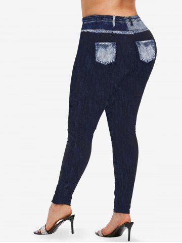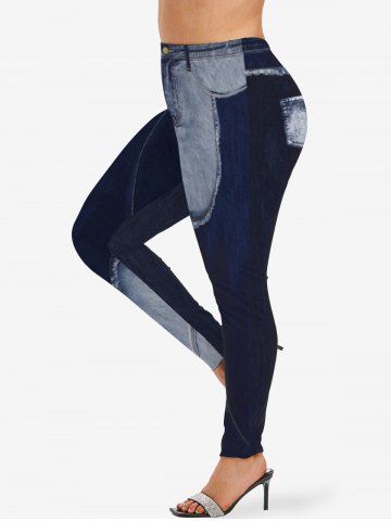 Graphic Leggings > Plus Size 3D Frilled Topstitching Ombre Denim Pockets Print Skinny Leggings
