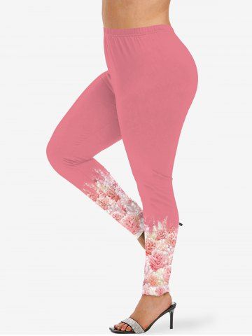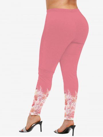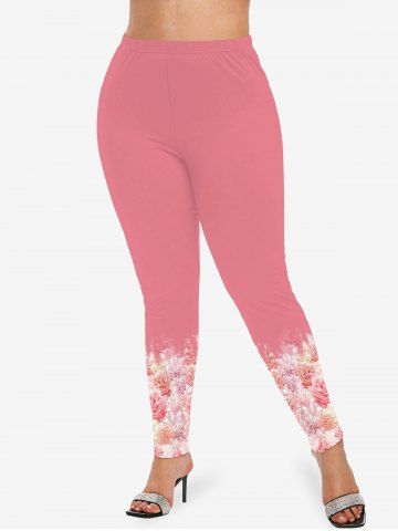Plus Size 3D Glitter Sparkling Faux Pearl Rhinestone Ombre Rose Flower Print Skinny Leggings - Light Pink - 3x