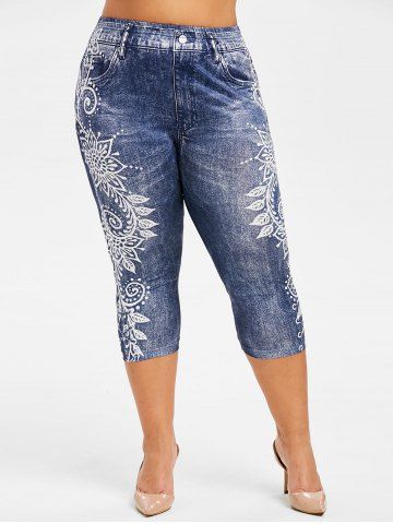 Plus Size 3D Pockets Button Paisley Print Capri Jeggings - Deep Blue - S | Us 8