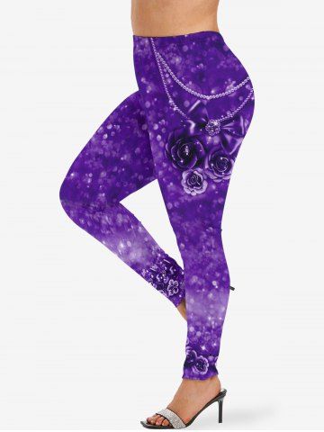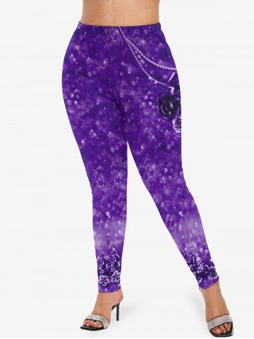 Plus Size Chains Bowknot Rose Flowers Sparkling Sequin Glitter 3D Print Leggings - Purple - 2x