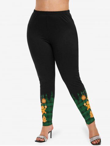 Plus Size Christmas Tree Snowflake Gingerbread Star Plaid Striped Print Skinny Leggings - Deep Green - 5x