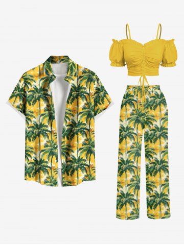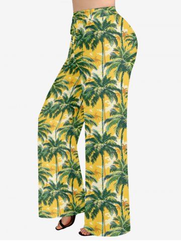 Plus Size Coconut Tree Print Drawstring Hawaii Wide Leg Pants - Yellow - 6x