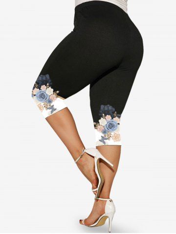 Plus Size Colorblock Floral Heart Printed Capri Leggings - Black - 1x | Us 14-16