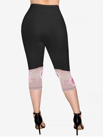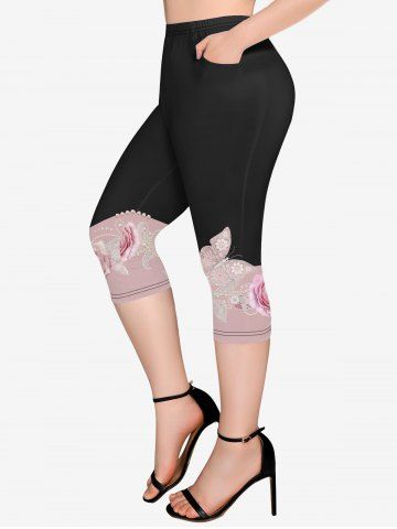 Plus Size Colorblock Flower Pearls Print Pockets Capri Leggings - Black - S