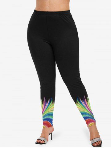 Plus Size Colorful Rainbow Swirls Colorblock Glitter 3D Print Leggings - Black - 1x