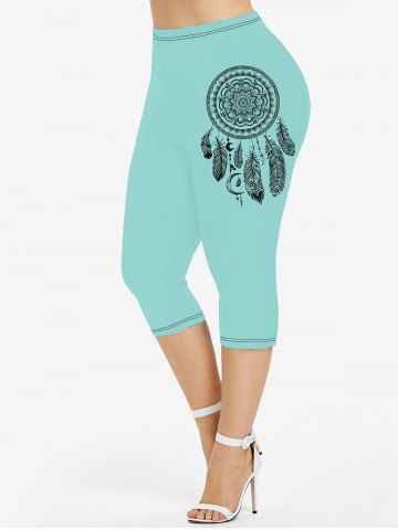 Plus Size Dreamcatcher Feather Moon Print Capri Leggings - Light Blue - 5x