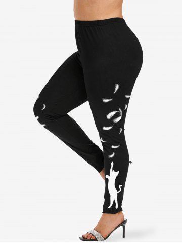 Plus Size Feather Cat Side Print Skinny Leggings - Black - 5x